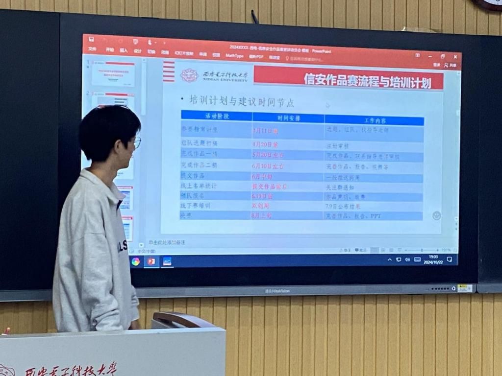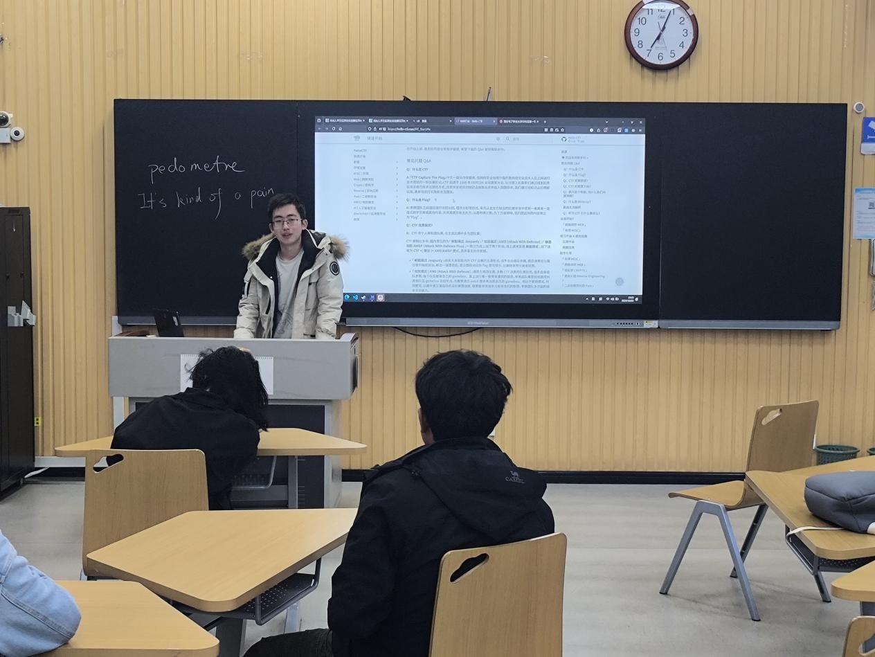 10月22日,信安作品比赛全国一等奖得主艾芃旭同学为2318031班同学介绍了信安技能赛相关知识。本次宣讲过程中,结合精心准备的相关网页界面,艾芃旭同学向同学们回顾了自己的信息安全技能赛参赛、获奖经历,首先为大家介绍了技能赛的校内选拔机制、初赛、赛区赛、决赛的流程以及类型,接着从听讲同学们的实际情况出发,为大家提供各个环节的学习方案与资料建议,鼓励大家积极参赛,在备战信息安全技能赛的过程中学习更多相关知识,加强自己以及合作实践能力。随着艾芃旭学长为大家揭开信息安全技能赛神秘面纱的一角,同学们在相关知识分享后表示对信息安全技能赛有了更加清晰的认知和展望。宣讲后半段答疑环节,同学们积极发问,走上讲台,与学长面对面交流,提出了自己诸如不敢参赛、害怕知识储备不足等疑问。艾芃旭同学为大家耐心地一一解答,为同学们介绍学校科协等相关基地并答疑。