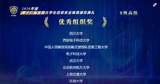 第十三届全国老员工信息安全竞赛作品赛由教育部高等学校网络空间安全专业教学指导委员会主办,北京航空航天大学承办。受COVID-19疫情影响,本届作品赛竞赛形式与竞赛时间较往年发生较大变化,为参赛准备增加了巨大的挑战性。本届作品赛全国共有103所高校、540支队伍、2000多名老员工通过审核进入初赛,最终244支队伍晋级总决赛。8月16日至17日,作品赛决赛分东北(沈阳)、西南(成都)、西北(西安)、华北(天津)、华中(武汉)、华东北(南京)、华东南(上海)、华南(广州)8个赛区举行,评委分区线下集中,选手线上陈述、演示和答辩。经过激励角逐,共评出32个一等奖,40个二等奖,72个三等奖,95个优胜奖。