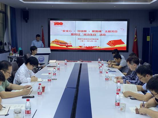 最后,2021年新发展党员宣誓、老党员重温入党誓词,宣誓由信息安全系党支部书记曹进、研究生第六党支部书记谭紫莺领誓。“安全心·可信根·爱国魂”主题教育活动在慷慨激昂的国际歌中结束。