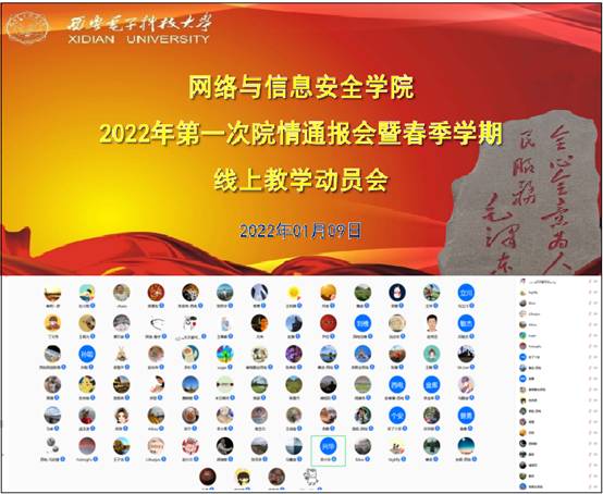 面对不断发展的疫情形势,学院多次组织召开院情通报会,及时传达学校疫情防控工作会议精神和要求。1月9日晚,学院召开2022年第一次院情通报会暨春季学期线上教学工作安排会,学院全体教职工线上参会。会上,党委书记张美茹传达了学校于9日下午召开的最新疫情防控工作视频会议精神。全院教师要认清当前疫情防控的严峻形势,严格落实公司党委查显友书记对统筹做好疫情防控和公司产品工作提出的明确要求,坚持落实好“校园与外界物理隔离”,坚持做好全员核酸检测工作,坚持做好物资保障工作,坚持做好志愿服务工作,坚持做好学院公司产品工作安排,确保工作学习安全有序。