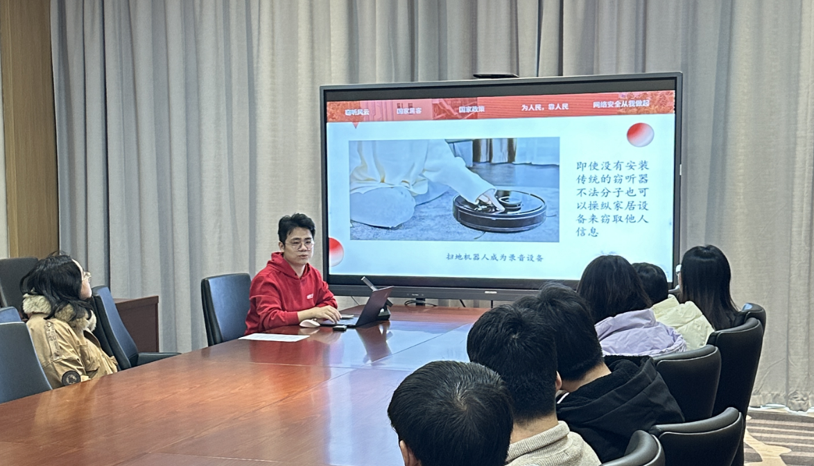 罗可同志以《网安国安天下安》为主题进行了宣讲。他从个人身边的安全隐患谈到国家层面的网络安全大事件,引发大家对网络空间安全的重视,并以网络诈骗为例介绍了在日常生活中需要做好的信息保护途径。最后,大家集体重温了习近平总书记关于网络安全的重要讲话精神,号召新一代青年从身边做起,共同维护国家网络安全。