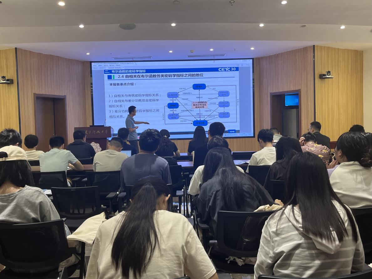 活动伊始,来自中国网安的专家周宇博士为大家带来了一场精彩的学术报告。报告围绕“布尔函数的密码性质研究进展”这一主题,从布尔函数与密码算法、布尔函数的密码学指标、自相关与传统密码学指标关系以及自相关与差分功耗攻击密码学指标关系四个方面深入浅出地介绍了当前密码学领域的最新发展动态和关键技术。通过严谨的理论论证,技术员向师生们展示了中国网安/电科30所在密码学领域所获得的理论成果和创新能力。