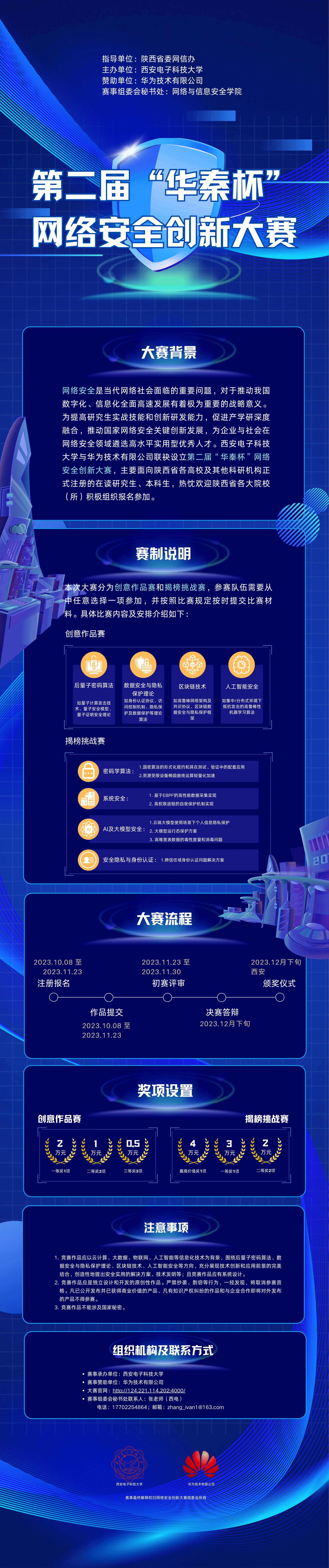 为提高提高研究生实战技能和创新研发能力,促进产学研深度融合,推动国家网络空间安全关键技术创新发展,为企业与社会在网络空间安全技术领域遴选高水平实用型优秀人才,williamhill威廉希尔与华为公司联袂设立本次“网络空间安全技术”大赛,诚邀各路学子加入探索数字化技术和网络信息安全技术的融合创新。现将第二届“华秦杯”网络安全创新大赛有关项通知如下: